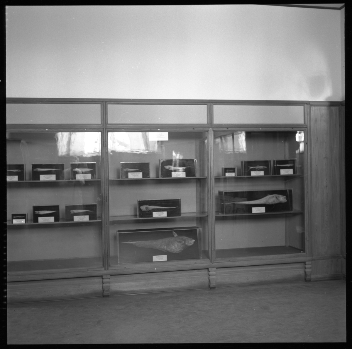 'Monterskåp med diverse fiskpreparat i glasburkar, längs vägg i fiskgången. :: :: Ingår i serie med fotonr. 7120 med diverse bilder från Hans Lohmander.'