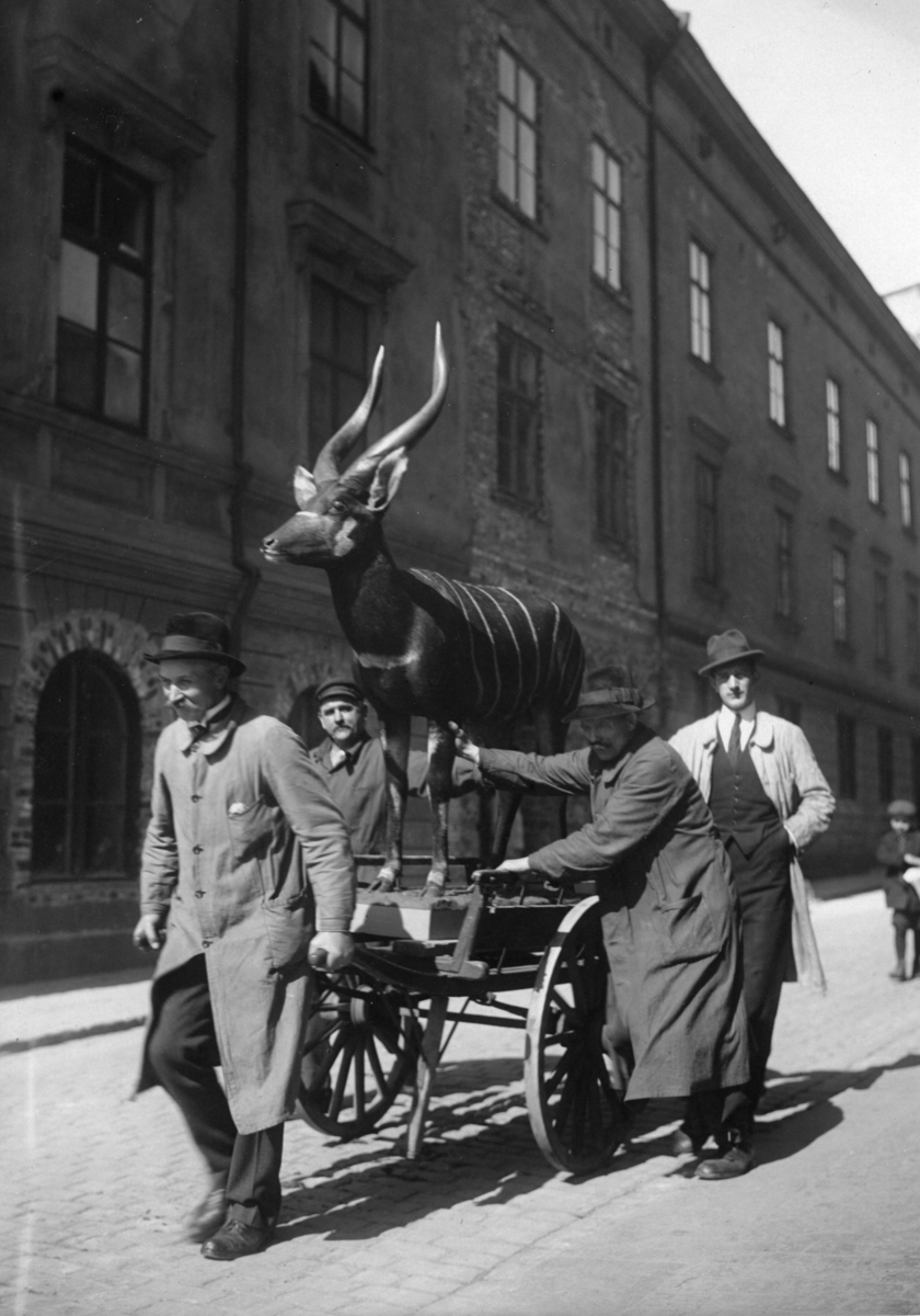 'Zoologiska avdelningens flytt till Naturhistoriska museet i Slottsskogen: Bongoantilopen transporteras på dragkärra till Slottsskogen. Anders Svensson drar kärran på en gata. 3 andra män invid kärran. :: :: Se fotonr. 5345:29, samma motiv.'