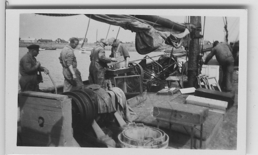 'Akkaexpedition, Bilder från Läsö och från båten (Skandia, FC51, FG51). :: :: 5 män i arbete på däck ombord en båt. I bakgrunden är land med byggnader synligt. Vev. Trätunna. Såll. Ihopfällbara stolar. :: :: Ingår i serie 5089:1-63. Se även fotonr 2401-2453.'