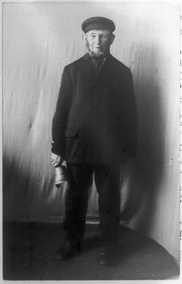 '1 man hållande en klocka, bjällra i ena handen. Iklädd hatt, keps. Sjöman? :: :: :: Ingår i serie med fotonr. 5139:1-36. Fotonr. 5139:1-17 ligger i en ask med texten ''med motiv från (enligt pappasken) Helgoland. För diapositiv.'' Fotonr. 5139:18-27 ligger i en pappask med texten: ''Helgoland (''Augusta'')'' en del för diapositiv. Fotonr. 5139:28-36 ligger i en ask med texten ''Dubbletter från Helgoland. Dessutom diapositiv från Kristineberg och Lysekil.'''