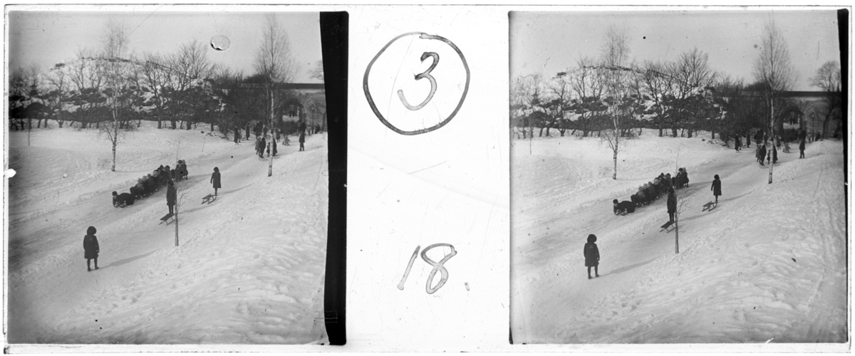 'Bildtext: ''Kälkbacke vid Sturevalven.'' :: Vy med barn och vuxna på snöklädda marken nedanför slottsbyggnaden. I förgrunden ett antal personer på kälkar i ett tåg efter varandra. :: :: Ingår i serie med fotonr. 5254, se även hela serien med fotonr. 5237-5267.'