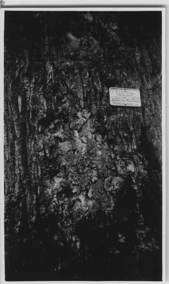 'Biologiska föreningens utfärd till Öland: :: :: Eniligt text på fotot: ''Gammal naturskyddad ek med märken efter stora ekbockens larver. Halltorps hage.'' Närbild på ekens stam med liten skylt med texten ''Naturminnesmärke, fridlyst. :: :: Se även fotonr. 2607-2625, 2583-2606 samt 2883-2911 från samma utfärd.'