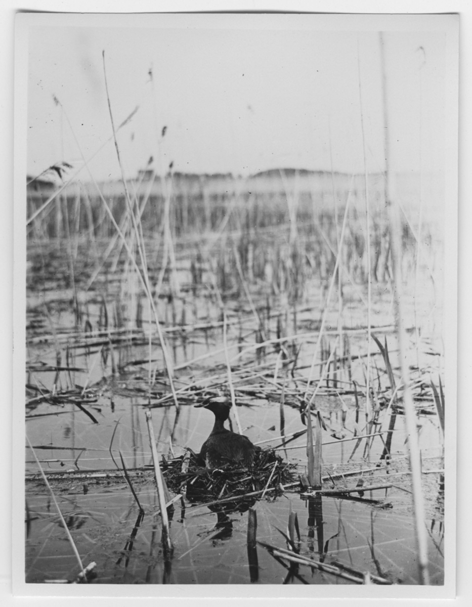 'Örondopping (enligt text på baksidan) på boet, sedd snett bakifrån. Simmande i vassvegetation i sjön. :: Text på baksidan: Skrattmåsarna måtte ha blåst larm. Örondoppingen spetsar öronen.'' :: :: :: Ingår i serie med fotonr. 2305-2346.'