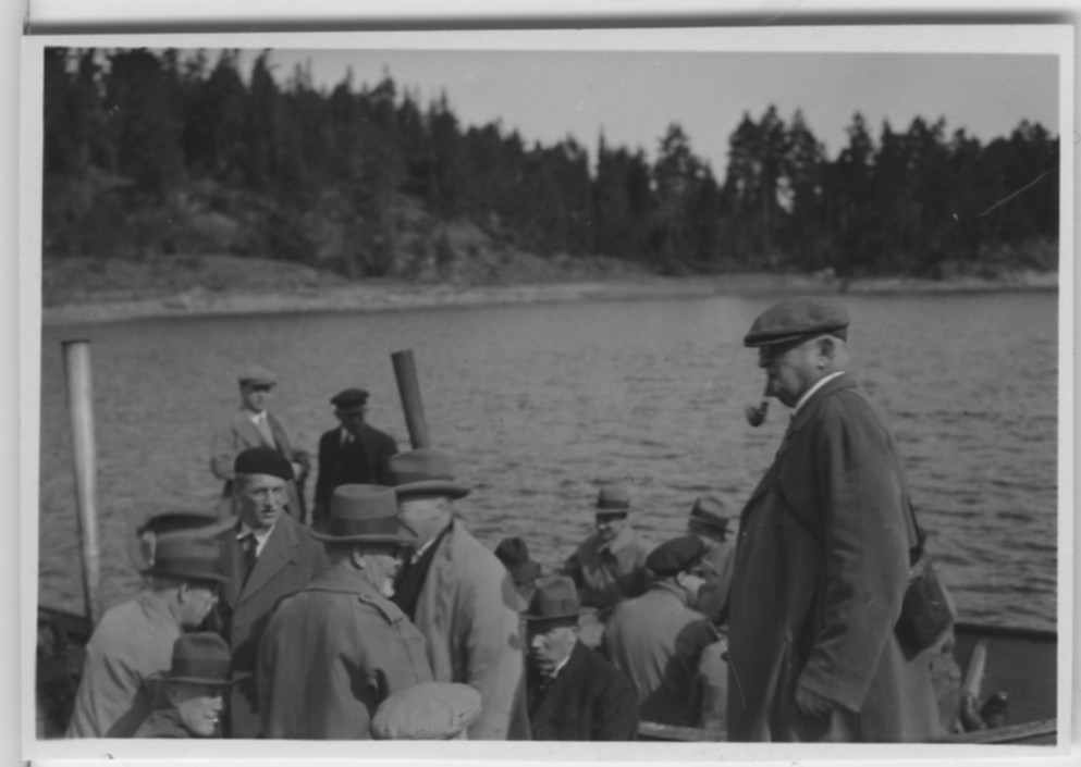 'Biologiska föreningens utfärd till Läckö och Ekens skärgård: :: :: gruppen i båt och på brygga, Leonard Axel Jägerskiöld står till vänster. :: :: Se fotonr. 3242-3254, 3255, 3256-3259, 3260-3285 samt 3889-3894.'