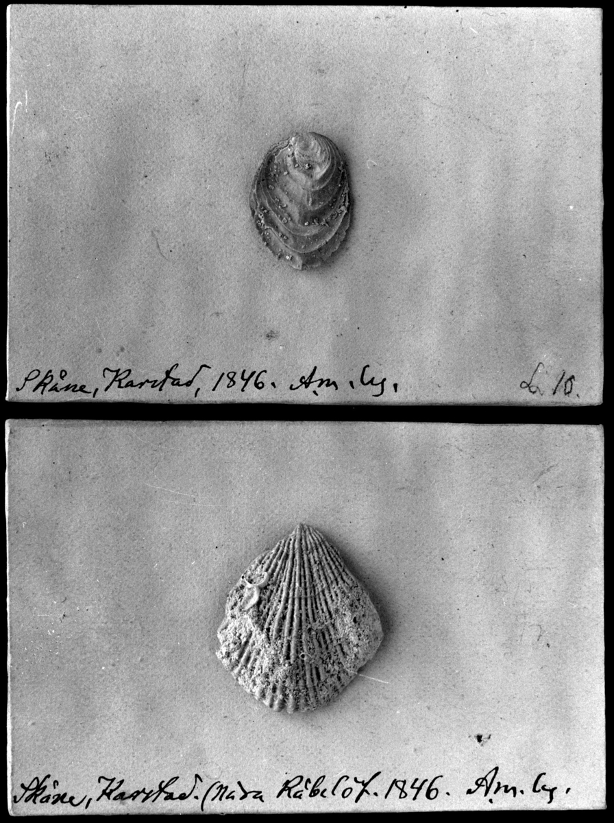 'Övre bildtext: ''Skåne, Ignaberga, 1846. Am. Ly. L. 10.'' :: Nedre Bildtext: ''Skåne, Karstad (nära Råbelöv). 1846. Am. Ly.'' :: :: Ostron (övre) och armfoting (nedre), 1846. Fyndlokal Skåne, Karstad. :: :: Ingår i serie med fotonr. 3957-3967 med foton av August Wilhelm Malms samling av kritfossil från Kristianstadstraken.'