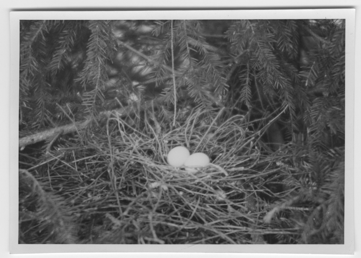 'Bo med 2 ägg, i en gran. Övergiven kull. :: :: Ingår i serie med fotonr. 4354-4365.'