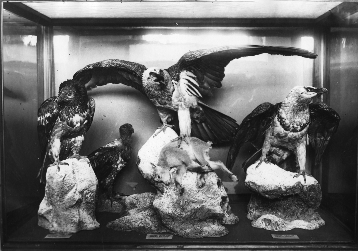 'Lammgam, 4 st fåglar, monterade i grupp. Enligt foto: ''Den flygande draken med familj''. :: :: Gammal hane (Av. ex. 4184) med stenbockskilling i klorna och hona (Av. ex. 4185) längst till höger. Ca 1 år gammal unge (Av. ex. 4186) längst till vänster och 2 1/2 månad gammal unge (Av. ex. 4187) i bakgrunden. :: :: Gruppen finns i monter nr 72, fågelgången (år 2007).'