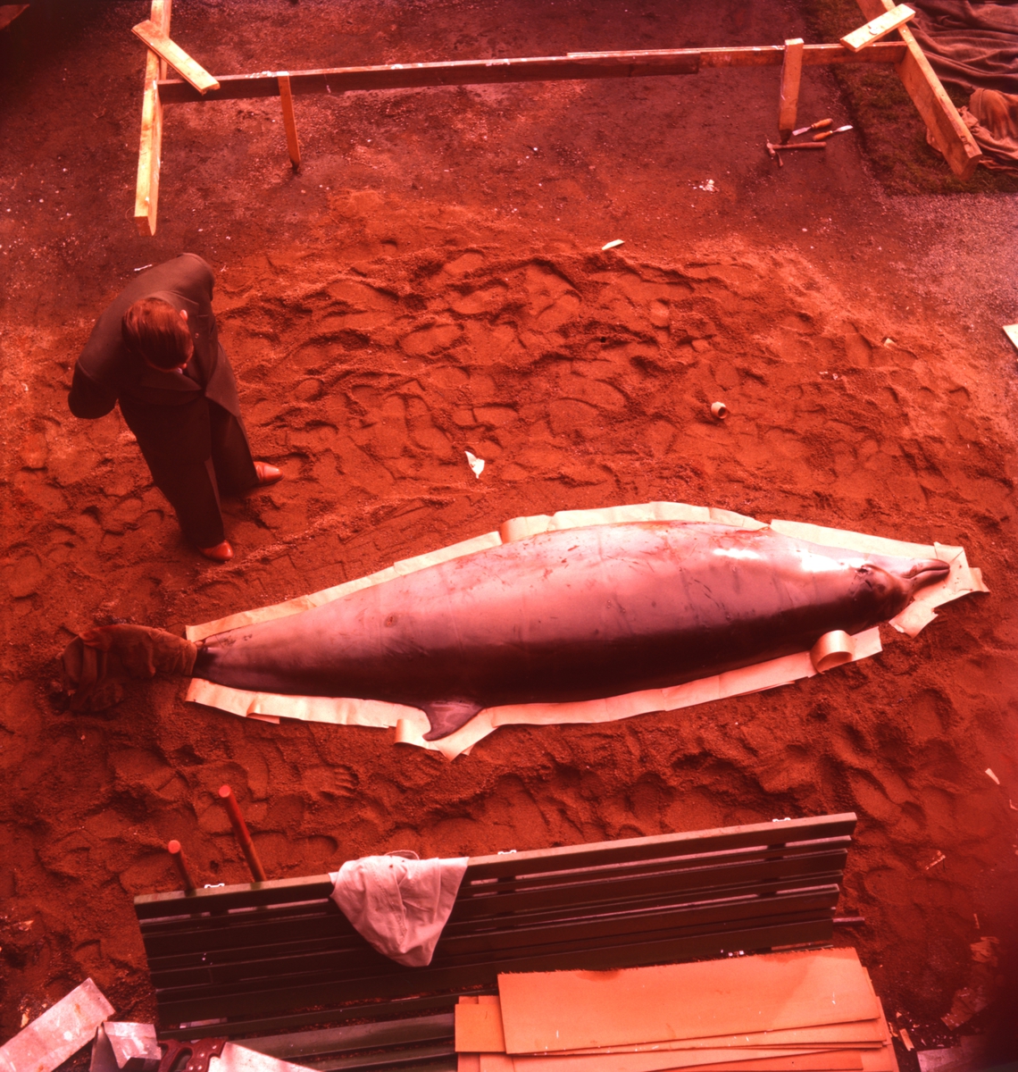 '2 näbbvalar, en gammal hona och en unge hittade, avgjutning gjord av ungen: :: :: bild tagen uppifrån och ner mot näbbvalen liggande på sandbädd och 1 person stående invid. Träbänk intill husväggen. På innergården under arbetet med avgjutningen. :: :: Ingår i serie med Fotonr. 4673:1-12.'