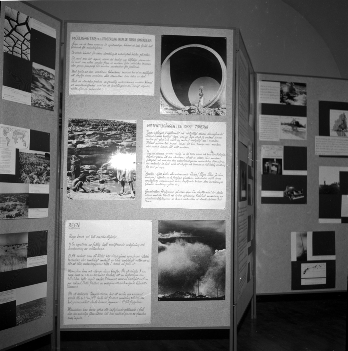 'Uställningen ''Människan och öknen - en utställning presenterad av UNESCO''. :: :: Utställningsskärm med texter och bilder titel ''Möjligheter till utveckling inom de torra områdena'', ''Vattentillgången i de torra områdena'' och ''Regn''. :: :: Ingår i serie med fotonr. 6984:1-18.'