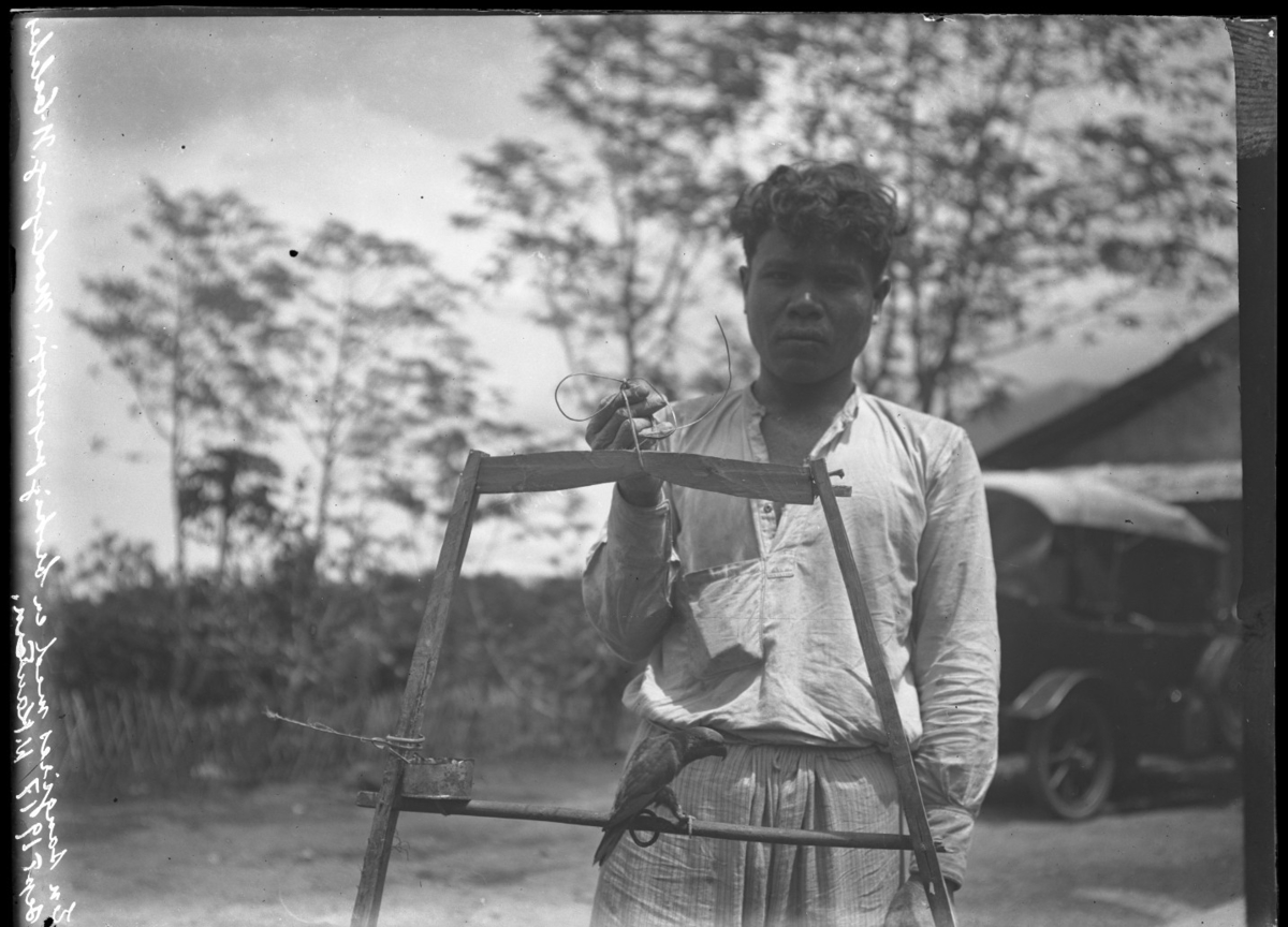 'Bildtext: ''En sangires? med en brokig papegoja.'' I man håller i en slags träställning där det sitter 1 papegoja. I bakgrunden skymtar något hjulförsett transportmedel samt en byggnad.'