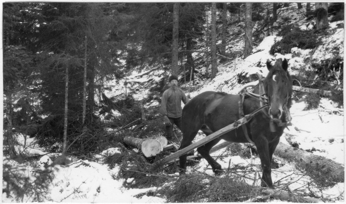 '1 man styr häst som drar timmerstockar. Skogskörning. :: :: Fotonr. 7046:335-353 indelade som ''Skogsavverkning och virkestransport.'' Ingår i serie med fotonr. 7046:1-383, 7047:1-33 och 7048:1-67 med bilder från Länsjägmästare John Lindners bildarkiv.'