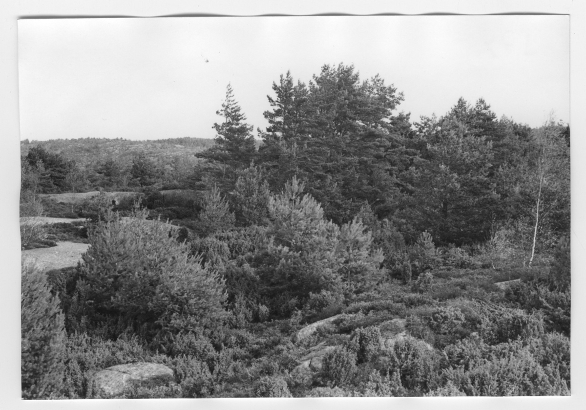 'Bildtext: ''Hällpartier. Riktning 50.'' :: :: Ingår i serie med fotonr. 6970:1-1125, dokumentation av Hisingens naturgeografi, visande landskapsformerna i stora drag och gjord inför exploateringen av området. Platserna för fotograferingen finns utsatta på karta i skala 1:4000 som finns på Göteborgs Naturhistoriska musem. Fotoriktningen mättes med kompass i gammalgrader.'