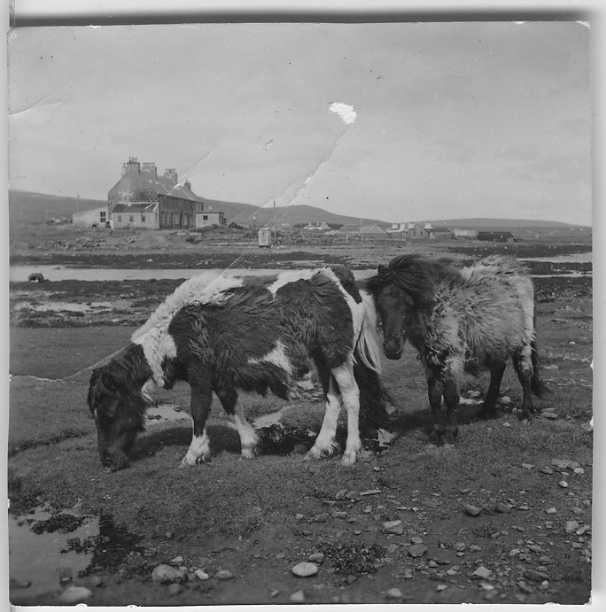 'Från ''Skageraks''-expeditionen till Hebriderna och Shetland: :: :: 2 shetlandsponnies betandes på en äng, bakgrunden är vatten, våtmark samt byggnader synliga. Anteckning på baksidan av fotografiet: ''Shetlandsponies Baltasound'' :: :: Ingår i serie med fotonr. 4111:1-43.'