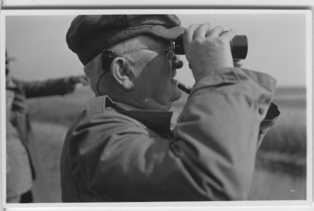 'Biologiska föreningens utfärd till Nordjylland: :: :: Vejlerne, närbild på 1 man, Leonard Axel Jägerskiöld, med kikare. :: :: Ingår i serie med fotonr. 3824-3859, se även fotonr. 3839-3847 från samma utflykt.'