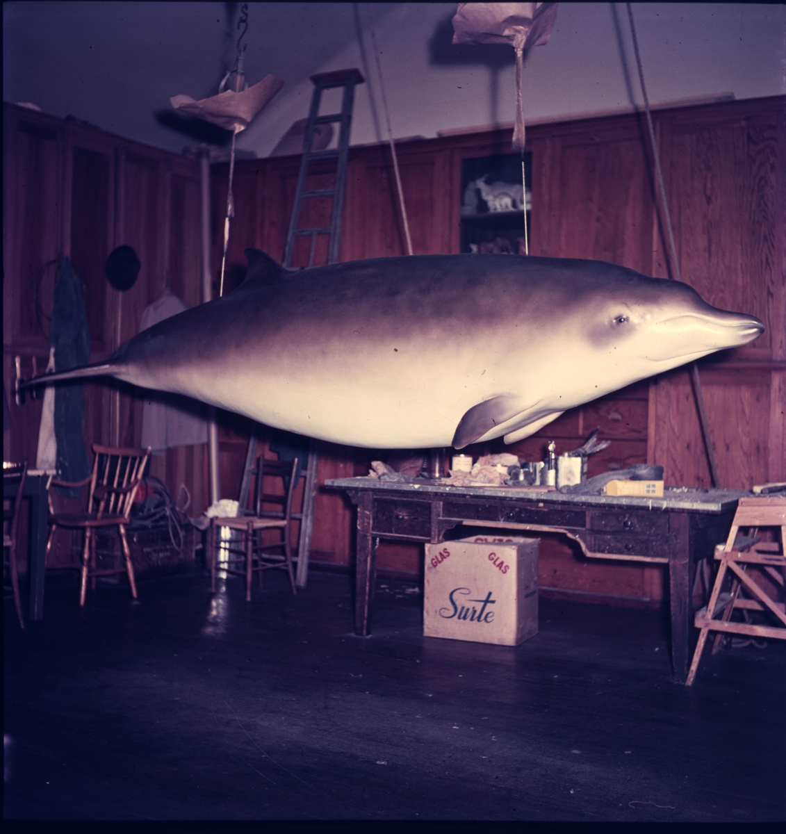 '2 näbbvalar, en gammal hona och en unge hittade, avgjutning gjord av ungen: :: :: Den färdiga avgjutningen av näbbvalen, sedd från sidan. :: :: Ingår i serie med Fotonr. 4673:1-12.'
