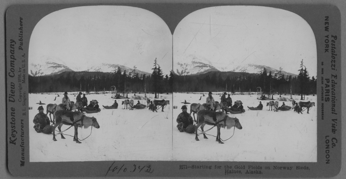 'Renar spända för pulkor/slädar med personer i.I bakgrundne snöklädda berg. :: ''9271- Starting for the Goldfields on Norway sleds, Haines, Alaska.'' :: :: Ingår i serie med fotonr. 315-422.'