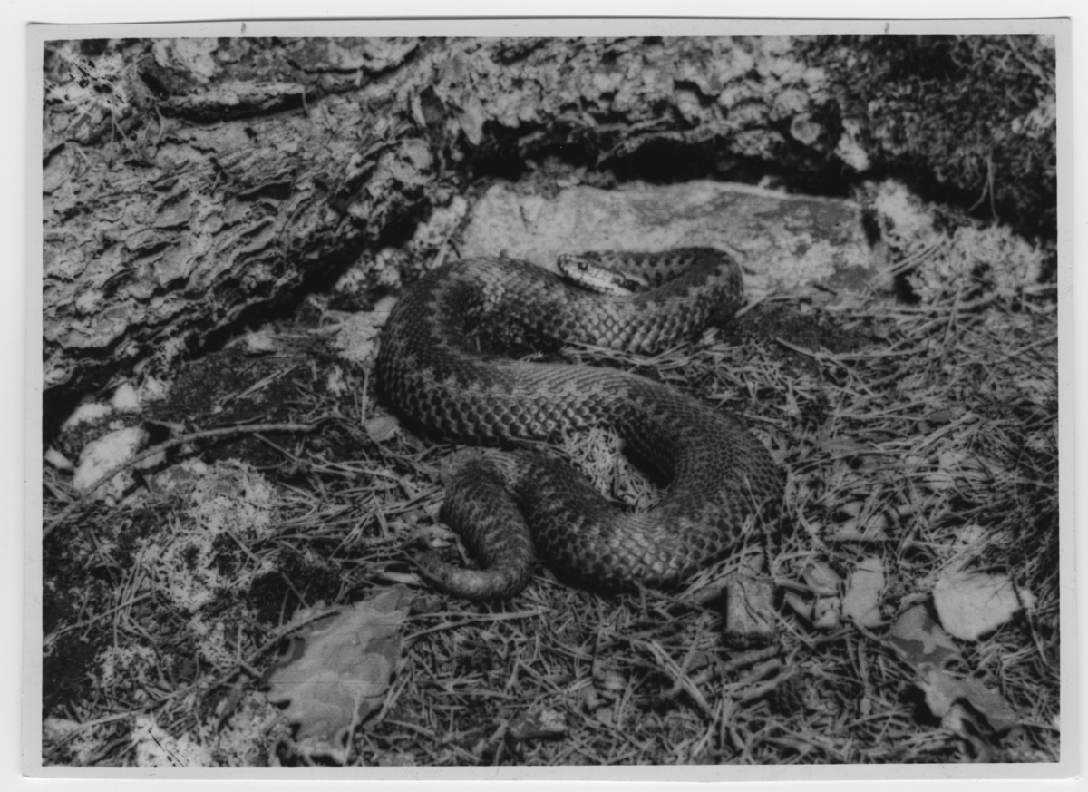 '1 huggorm på marken, i viloställning. :: :: Ingår i serie med fotonr. 4501:1-60 ur ingenjör Otto Cyréns ''Ormar i fantasi och verklighet''. Bilden använd på s. 91 i verket.'