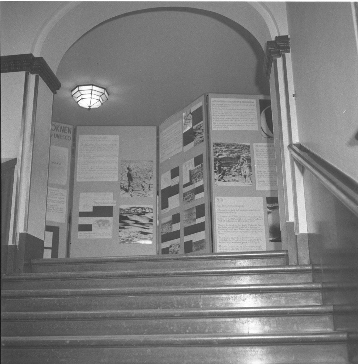 'Uställningen ''Människan och öknen - en utställning presenterad av UNESCO''. :: :: Utrymmet ovanför stentrappan sett från trappan och uppåt. Utställningsskärm med texter och bilder. :: :: Ingår i serie med fotonr. 6984:1-18.'