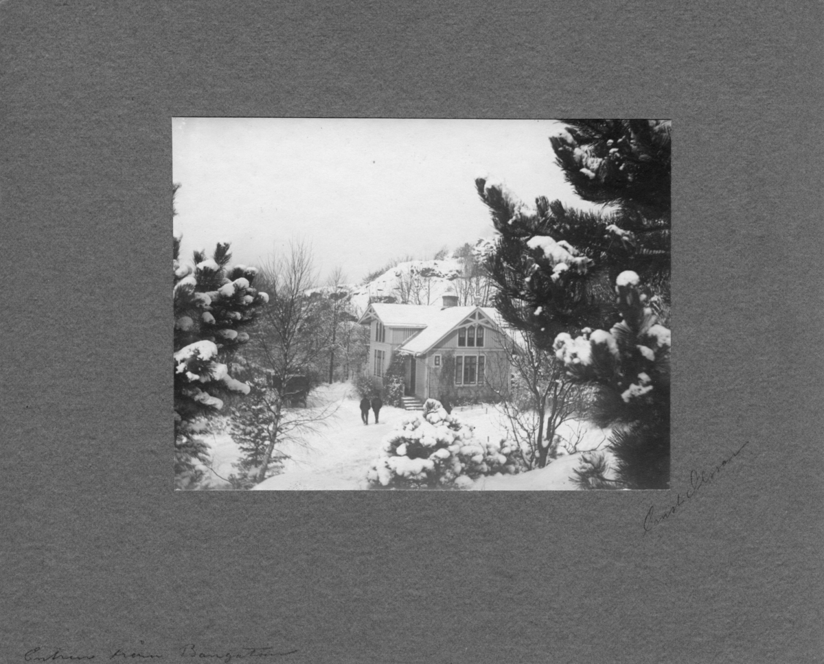 'Entrén från Bangatan, med hus och grind. Snöklädda träd, granar. :: Vinterbild. 2 gående personer, ev. bil.'