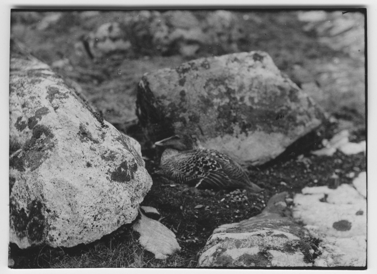 'Ejder, ruvande, hona intill stenblock på berghäll. Enligt bildtext: Vacker bild även av mimikry - honans skyddande färger smälter samman med stenblockens. :: :: Ingår i serie med fotonr. 817-841.'