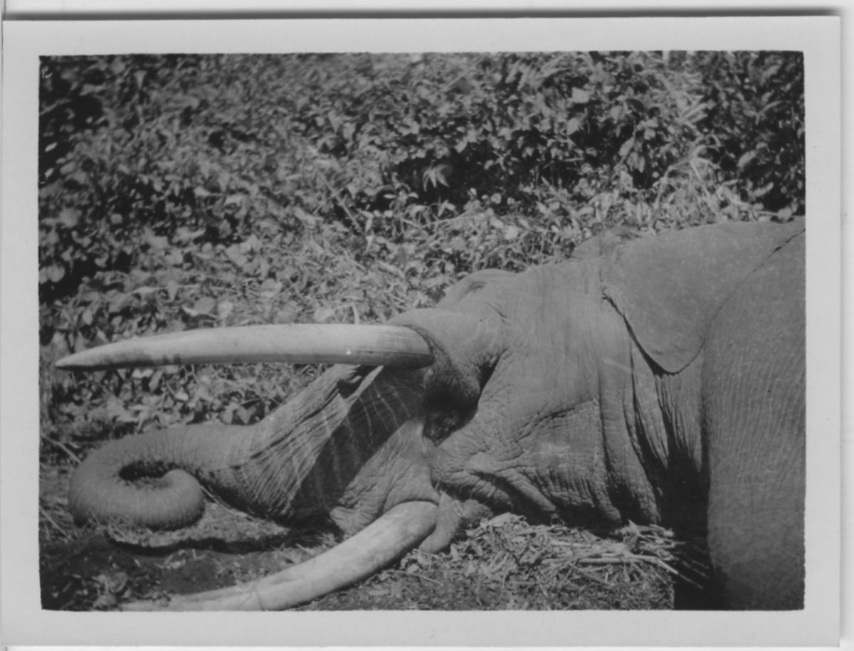 'Skjuten elefant, närbild på liggande huvud med betar. :: :: Serie fotonr 1434-1449'