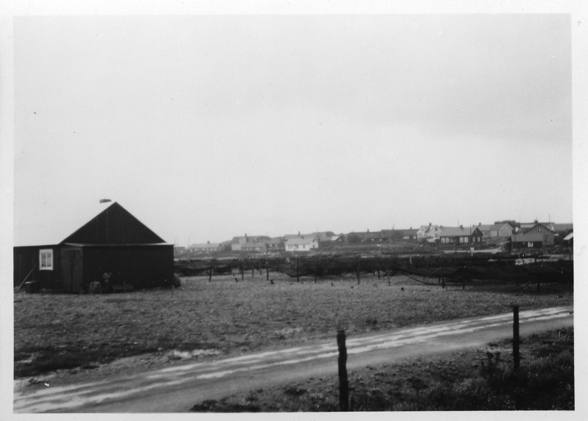 'Akka-expeditionen sommaren 1930: :: :: Fiskeläget i Träslöv: Laboratoriebyggnaden med drivnättorkningsplatsen, på avstånd. I fonden hus. :: :: Ingår i serie med fotonr. 2033-2087.'