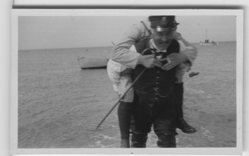 'Göteborgs Biologiska förenings utfärd till Måkläppen och Falsterborev: :: :: ''Lots bärande en av deltagarna'' i land från båten, vid Måkläppen. Kläder. Klädsel. :: :: Se fotonr. 1384-1395, 1618-1639, 1640-1648 samt 3229 från samma utfärd.'