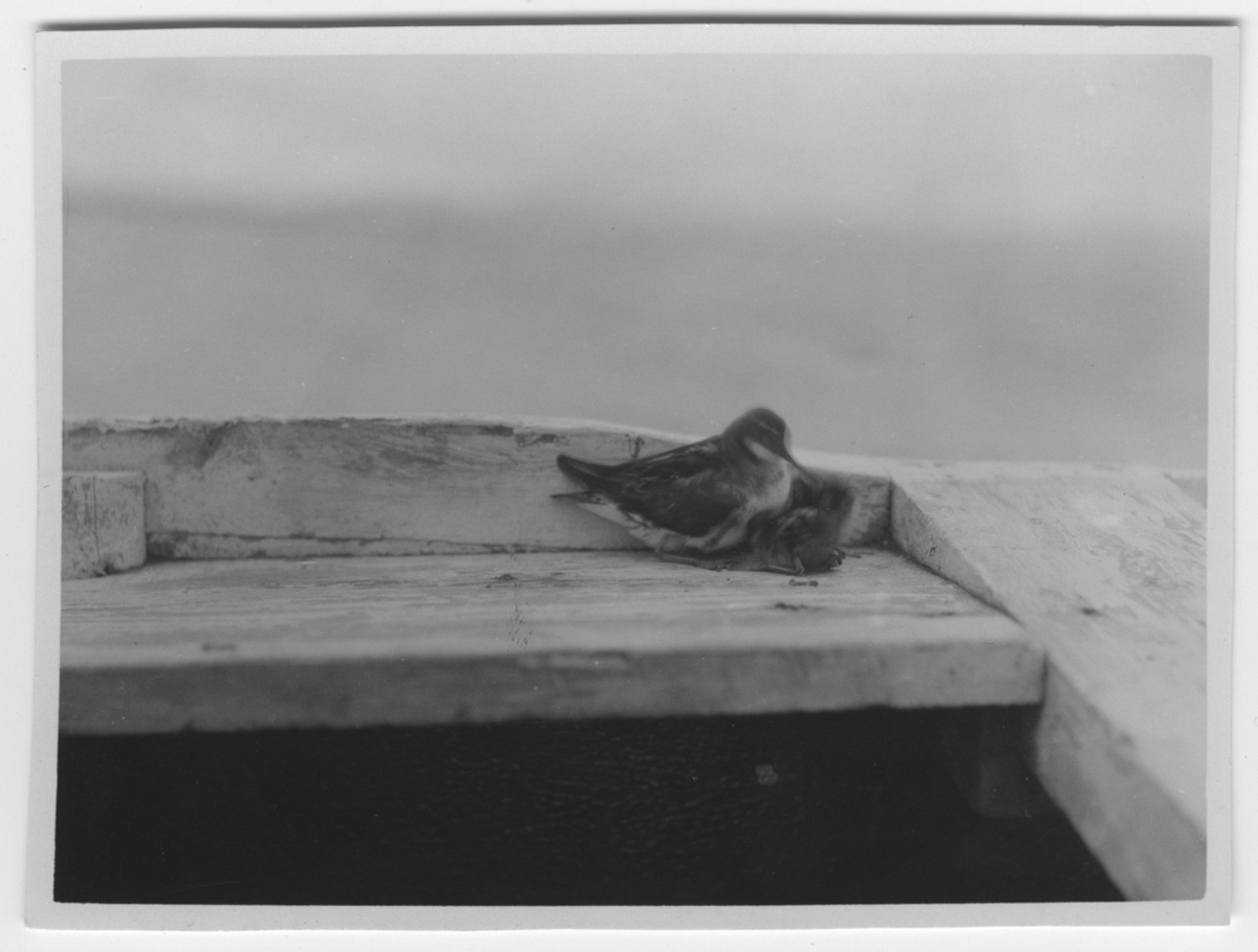 Smalnäbbad simsnäppa, hane med ungar, näribild, ringmärkta vid Enaälvens utlopp i Ånnsjön. Oskarp.