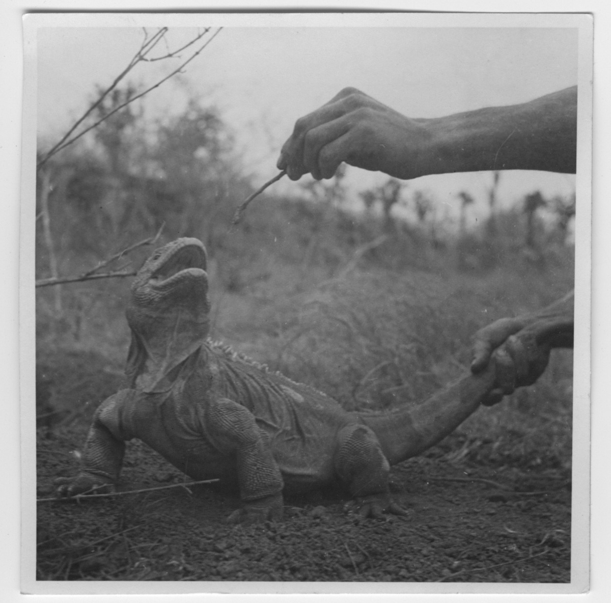 'Galapagosleguan, man håller fast den i stjärten och retar den med en pinne. Närbild. :: :: Se serie med fotonr. 3779-3822.'