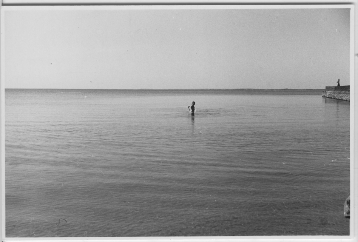'Biologiska föreningens utfärd till Nordjylland: :: :: Hvalpsund, 1 person badar, piren syns till höger. :: :: Ingår i serie med fotonr. 3824-3859.'