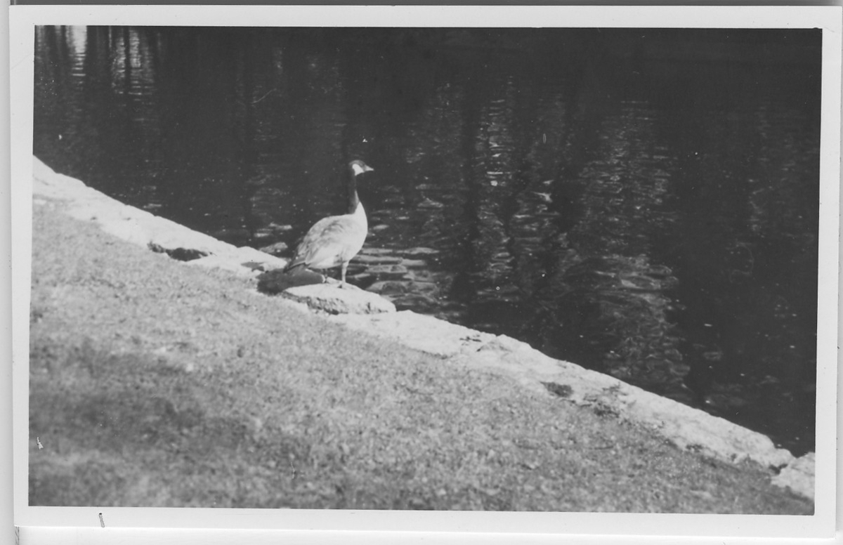 'Biologiska Föreningens utfärd till Oset och Kvismaren. :: :: En gås sittande på en stenmur intill en kanal. :: :: Ingår i serie med fotonr. 4386:1-18.'