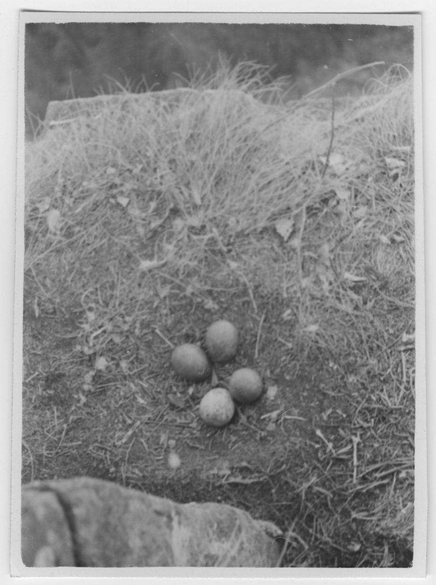 Pilgrimsfalk, bo med 4 ägg. Närbild. Boet på klippavsats.