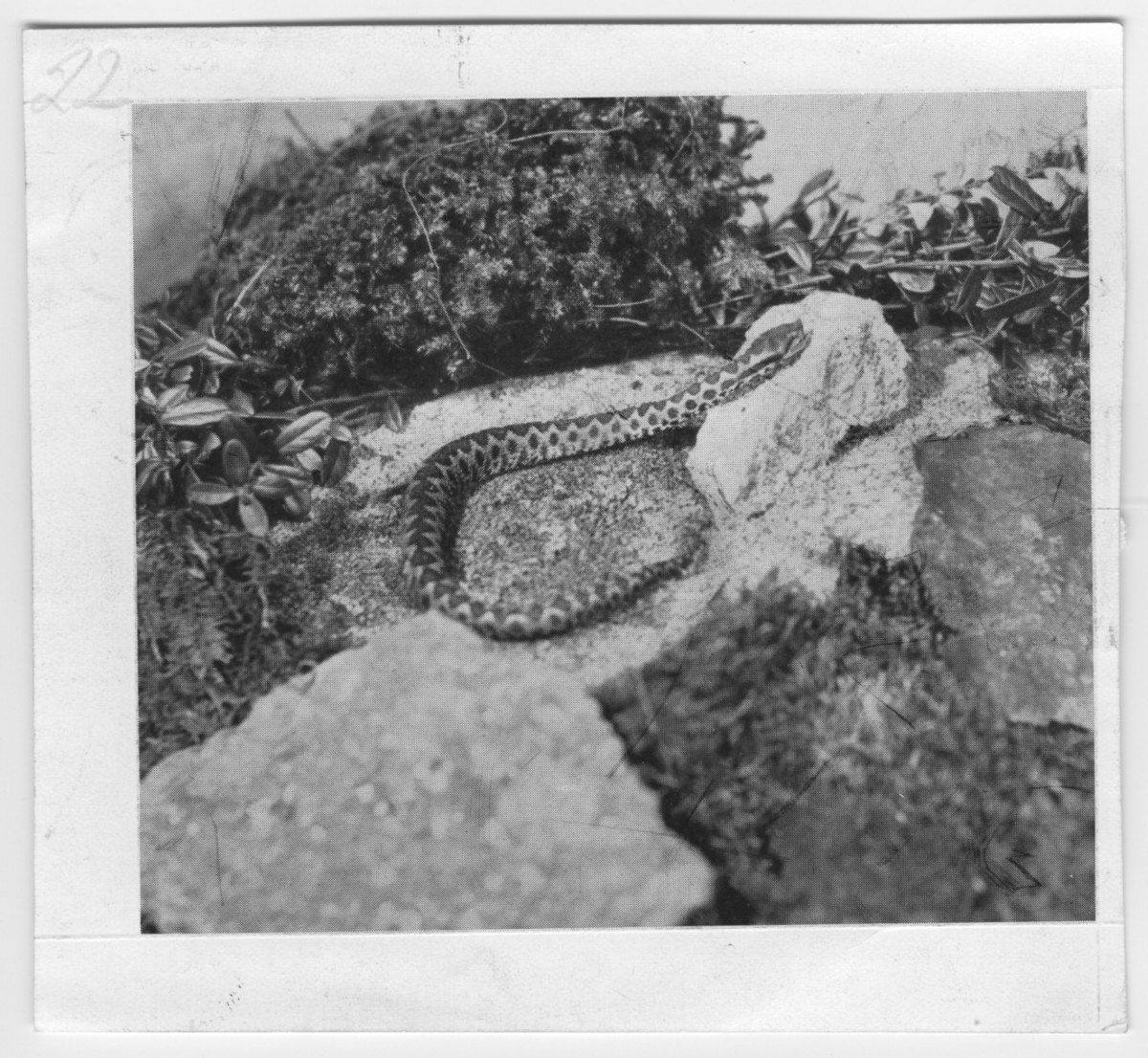 '1 latasts viperaorm liggande på stenblock, i terrarium. (Sid 73.) :: :: Ingår i serie med fotonr. 4501:1-60 ur ingenjör Otto Cyréns ''Ormar i fantasi och verklighet''. Bilden med på s.137 i verket.'