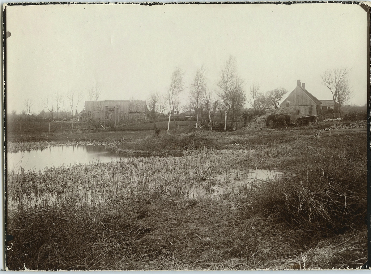 'Rörhöna, bo med omgivning. I bakgrunden hus/gård. Häst med vagn intill en gödselstack. 2 män lastar gödsel på vagnen. I förgrunden våtmark. :: :: Se fotonr. 46-48.'
