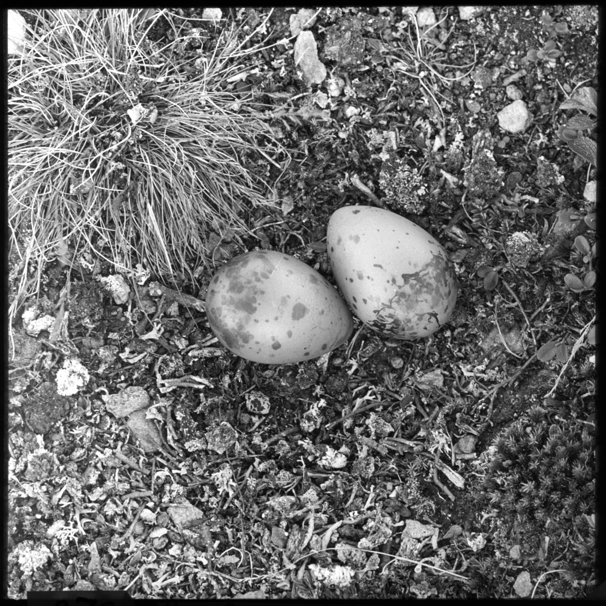'Bildtext: ''Fjällabbens ägg.'' Närbild på 2 ägg av fjällabb. :: :: Ingår i serie med fotonr. 5173:1-7, numrerade ned bildnr 278-284. Se även hela serien med fotonr. 5155-5174.'