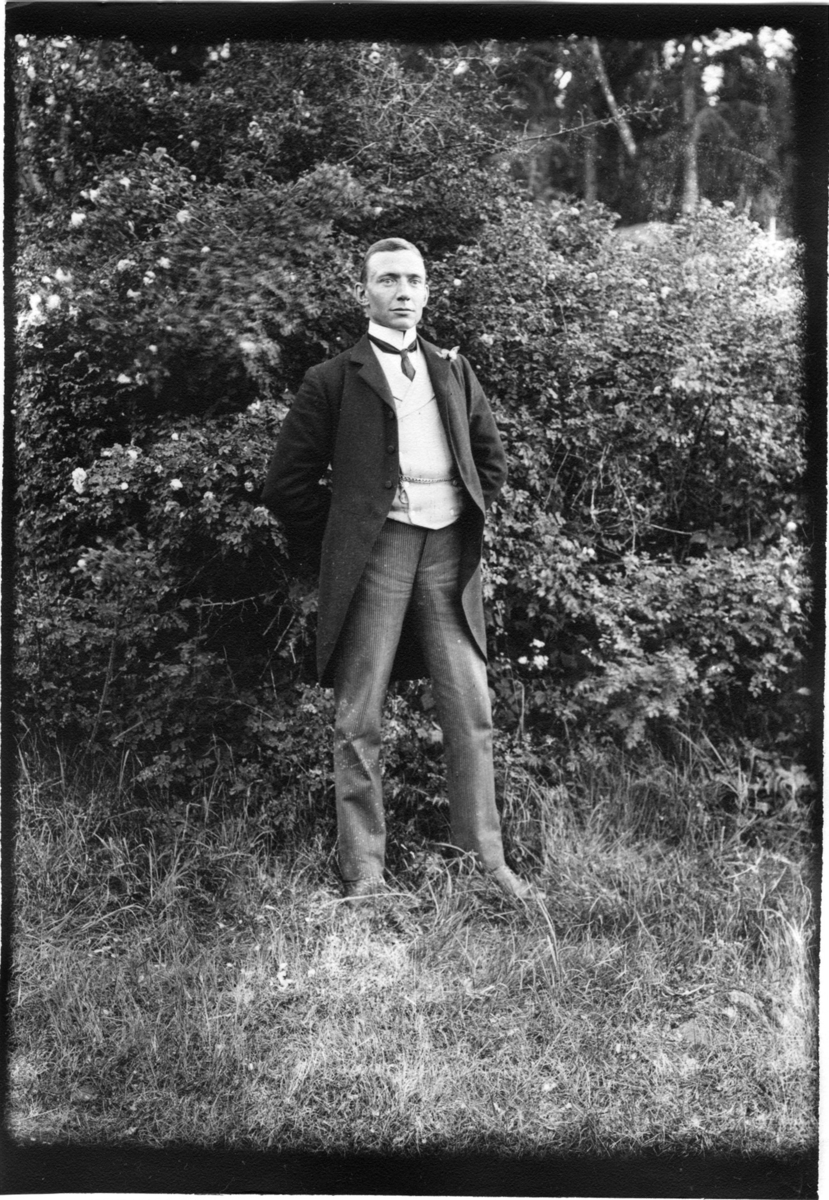 'Diverse fotografier från bl.a. dåvarande Nordrhodesia, nu Zambia, tagna av Konsul Magnus Leijer. :: :: En man ståendes framför ett buskge.'