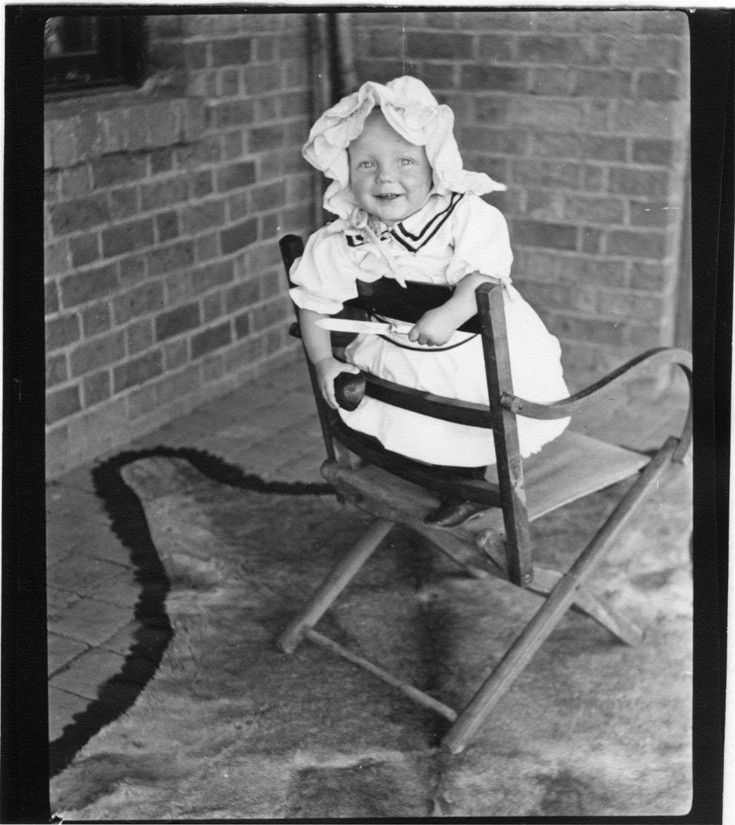 'Diverse fotografier från bl.a. dåvarande Nordrhodesia, nu Zambia, tagna av Konsul Magnus Leijer. :: :: Ett leende barn ståendes på en stolsits lutande sig mot ryggstödet. Fotograferad från nära håll.'