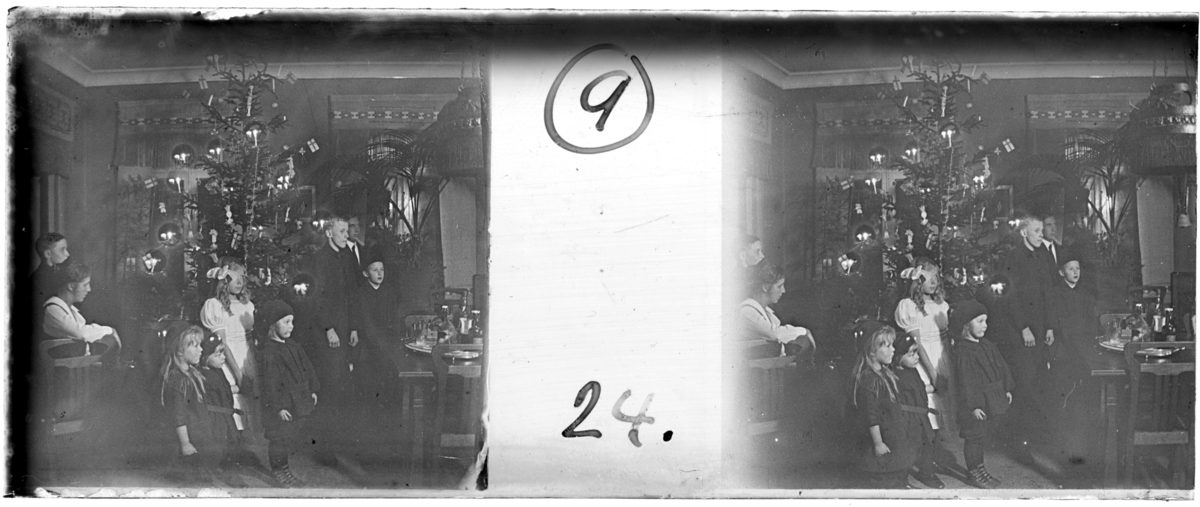 'Bildtext: ''Juldagen, hos Malmbergs.'' :: Rum med ca 9 barn, flickor och pojkar. I bakgrunden julgran med ljus, flaggor, glitter och små smällkarameller. Bord och trästolar, på bordet bricka med dricksglas och glasflaskor. :: :: Ingår i serie med fotonr. 5260:1-14. Se även hela serien med fotonr. 5237-5267.'