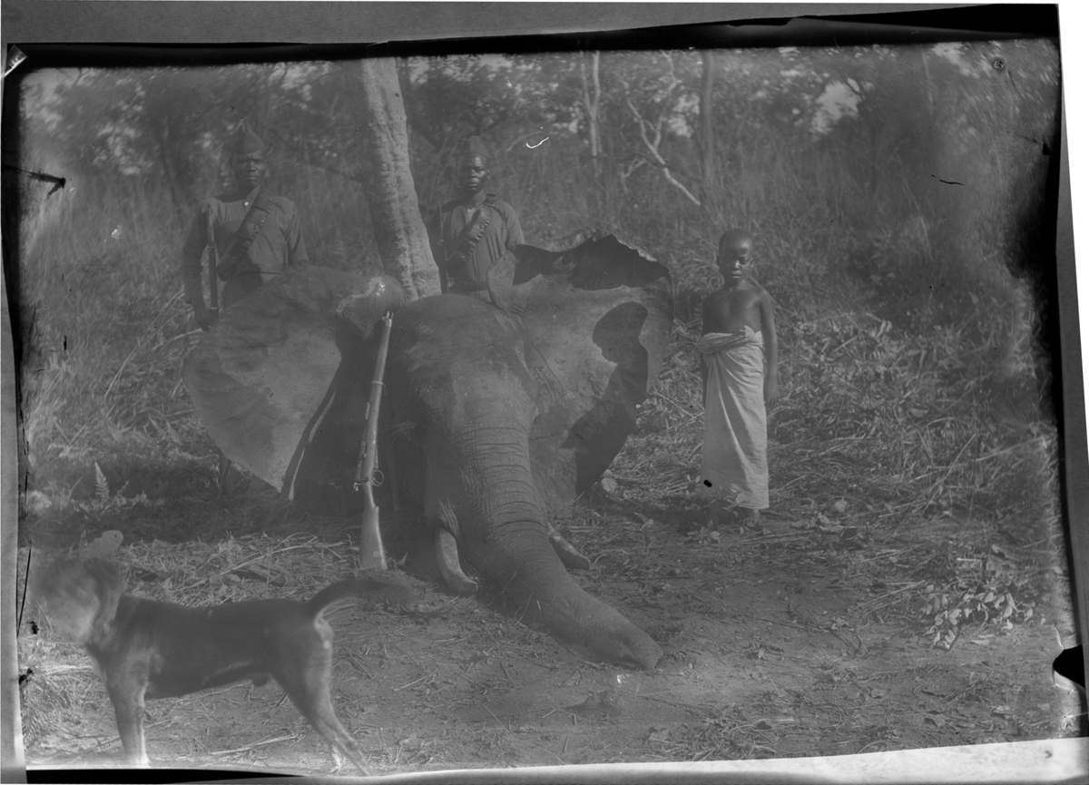 'Diverse fotografier från bl.a. dåvarande Nordrhodesia, nu Zambia, tagna av Konsul Magnus Leijer. :: :: Fälld elefant fotograferad framifrån, 1 hund i förgrunden. 1 pojke bredvid elefanten och 1 gevär lutat mot elefantens huvud. Bakom kroppen står 2 män.'