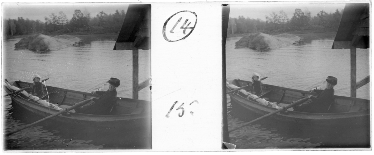 'Bildtext: ''Entering boat shed.'' (Anländer till båtskjulet) :: 1 barn, flicka (Rhoda) och 1 kvinna (Elsa) i en båt med åror och nedlagt segel. På väg till landningsstället med båtskjulet. :: :: :: Ingår i serie med fotonr. 5251:1-21, se även hela serien med fotonr. 5237-5267.'