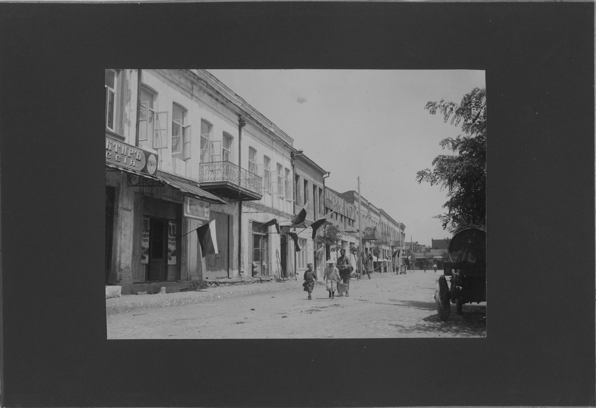 'Gatuvy med grusväg där människor går, barn, man. Till höger står en vagn. :: :: Ingår i serie med fotonr. 5288:1-30. Se även fotonr. 5269-5292 med bilder från Stuxbergs resa till Kaukasien.'