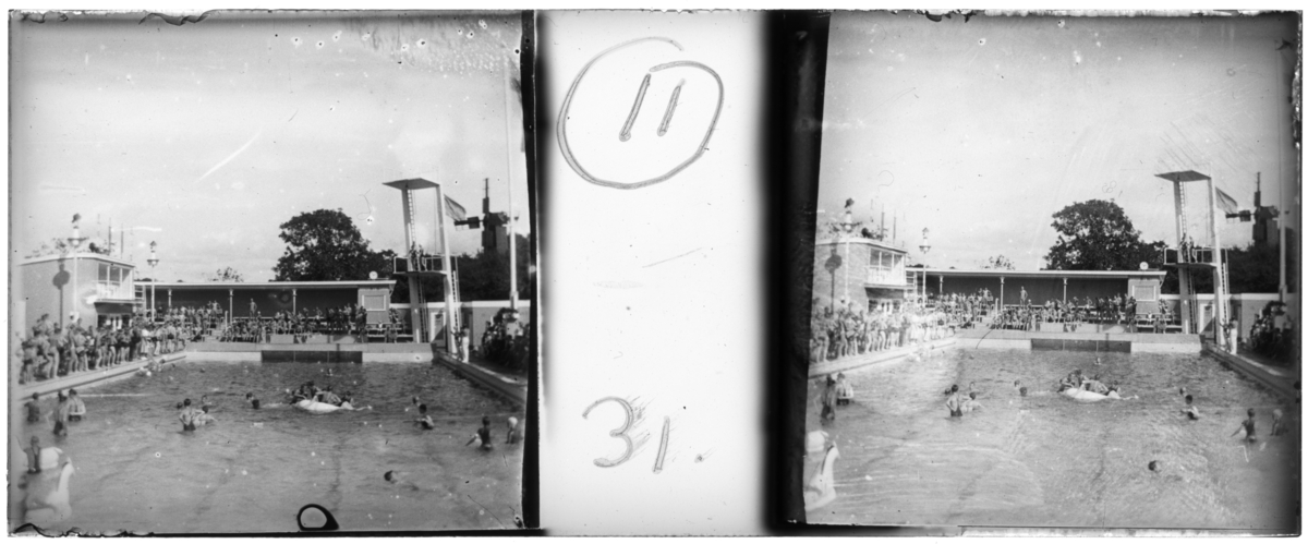 'Bildtext: ''Lisebergsbadet, augusti 1936.'' :: Vy över bassängen med hopptorn, byggnad och läktare runt. Stor folksamling på bassängkanten kring bassängen. Människor i bassängen. Män, kvinnor, barn. :: :: (bilden togs då Lisebergsbadet öppnades) :: Ingår i serie med fotonr. 5267:1-18. Se även hela serien med fotonr. 5237-5267.'