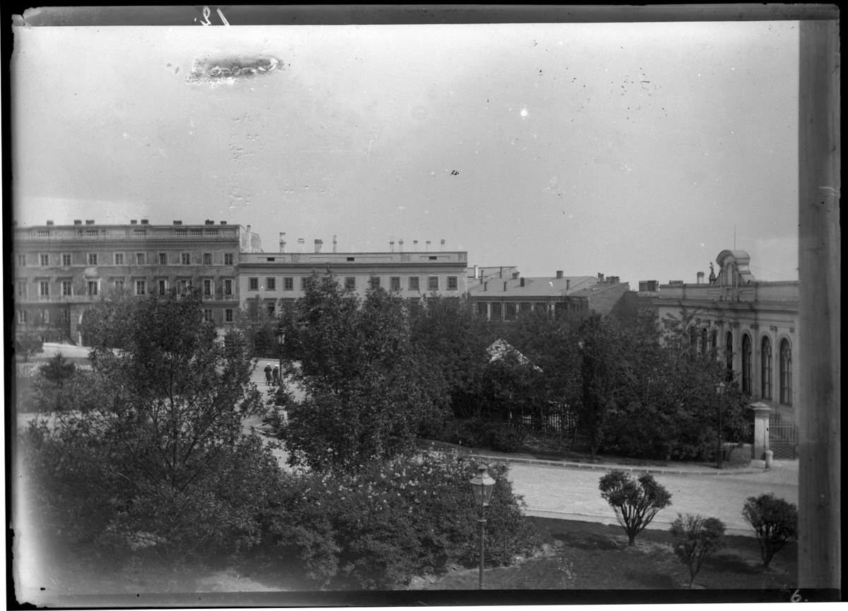 'Vy med byggnader, väg, promenerande människor, ev. park, grönområde. Lyktstolpe, gatulampa. :: :: Ingår i serie med fotonr. 5278:1-21. Se även fotonr. 5269-5292 med bilder från Stuxbergs resa till Kaukasien.'