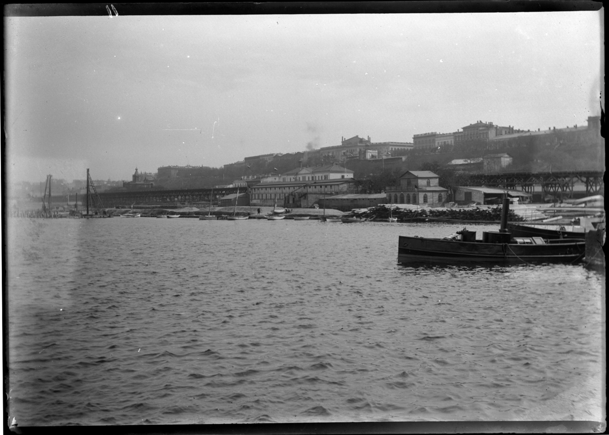 'Vy med vatten, flod? Där det ligger båtar invid kaj. På avstånd hus och byggnader. Timmerstockar ligger ner mot vattnet. Ev. bro. :: :: Ingår i serie med fotonr. 5278:1-21. Se även fotonr. 5269-5292 med bilder från Stuxbergs resa till Kaukasien.'