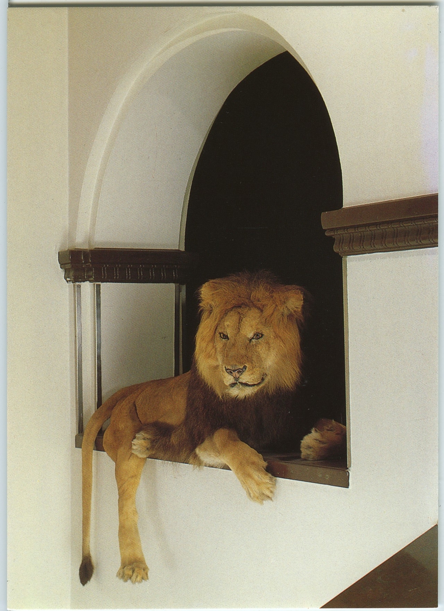 'Ingår i en serie med Fotonr. 5419 med Göteborgs Naturhistoriska museums olika vykort genom åren. :: :: ''Simba'' afrikanskt, tamt, lejon monterat av Björn Wennerberg. Finns uställt på Göteborgs Naturhistoriska museum.'