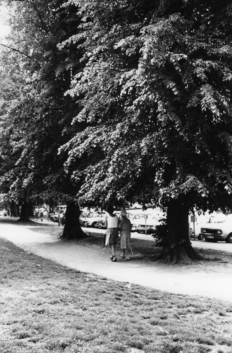 'Trädutställningen 1978 Göteborgs Naturhistoriska museum: :: Fotograferat i riktning från korsningen Vegagatan-Rosengatan mot Slottsskogen. På bilden syns allén längs Vegagatan. De 2 främre är lindar och det tredje trädet är en bok. På gångstigen går en äldre dam med käpp stödd av en yngre kvinna mot Slottsskogen och bilar står parkerade längs Vegagatan. :: :: Ingår i serie med fotonr. 5527:50-68.'