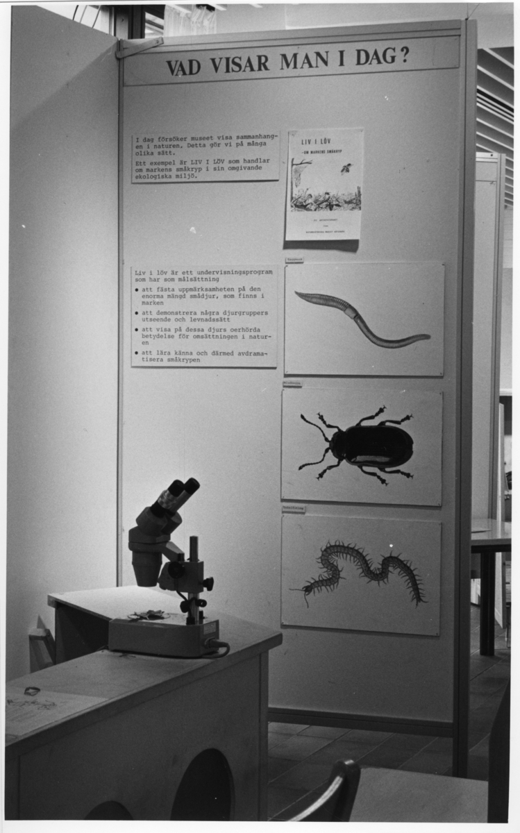 'Foto på Jubileumsutställningen, Göteborgs Naturhistoriska museum 150 år. :: :: Utställningsskärm: ''Vad visar man idag?'' angående vad museet arbetade med 1983. med smådjur som ex. Teckningar på: daggmask, enkelfoting, sladbagge. I förgrunden mikroskop-plats.'