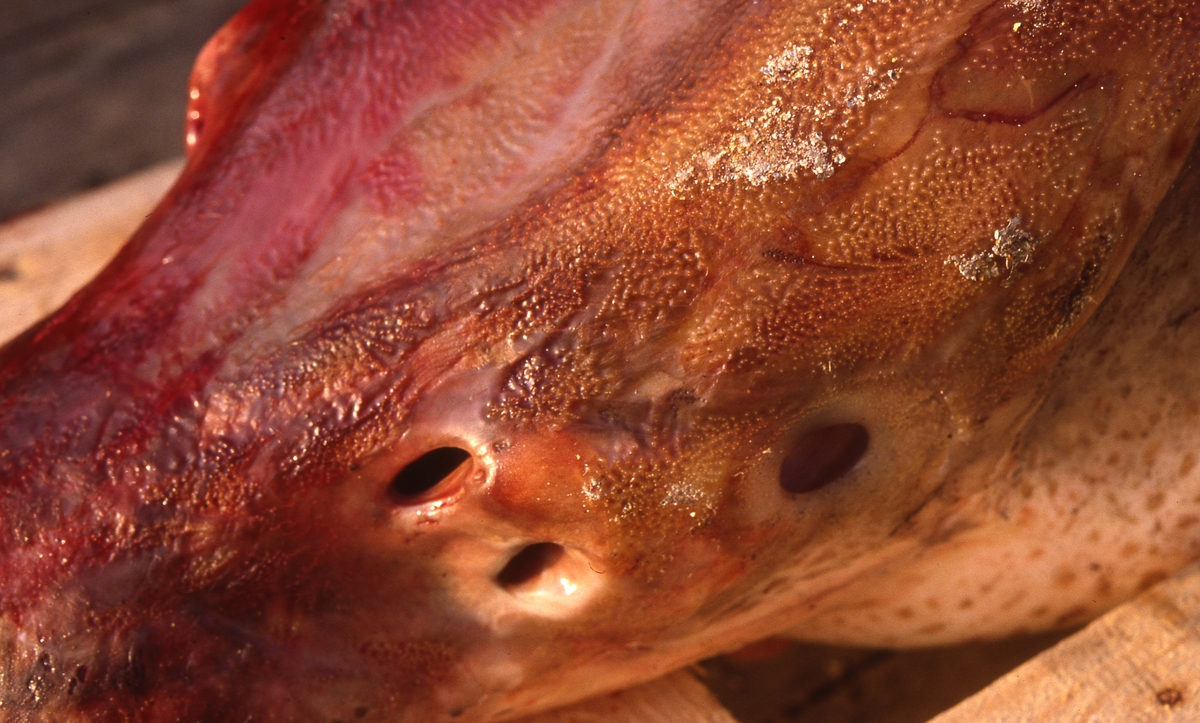 'Stör fångad i Nordsjön: :: :: Detaljbild av huvud. :: :: Ingår i serie med fotonr. 6029:1-12. Se även fotonr. 6028.'