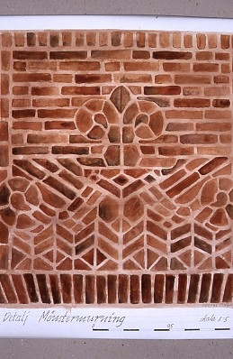 'Foton, teckningar och modeller av studenter från Chalmers Tekniska högskola, Institutionen för Arkitekturhistoria, Göteborg. Foton och teckningar av detaljer från Naturhistoriska museets byggader, byggnadsvård. :: :: Ingår i serie med fotonr. 6929:1-21.Detaljbild av tegelvägg med mönstermurning. Skala 1:5.'