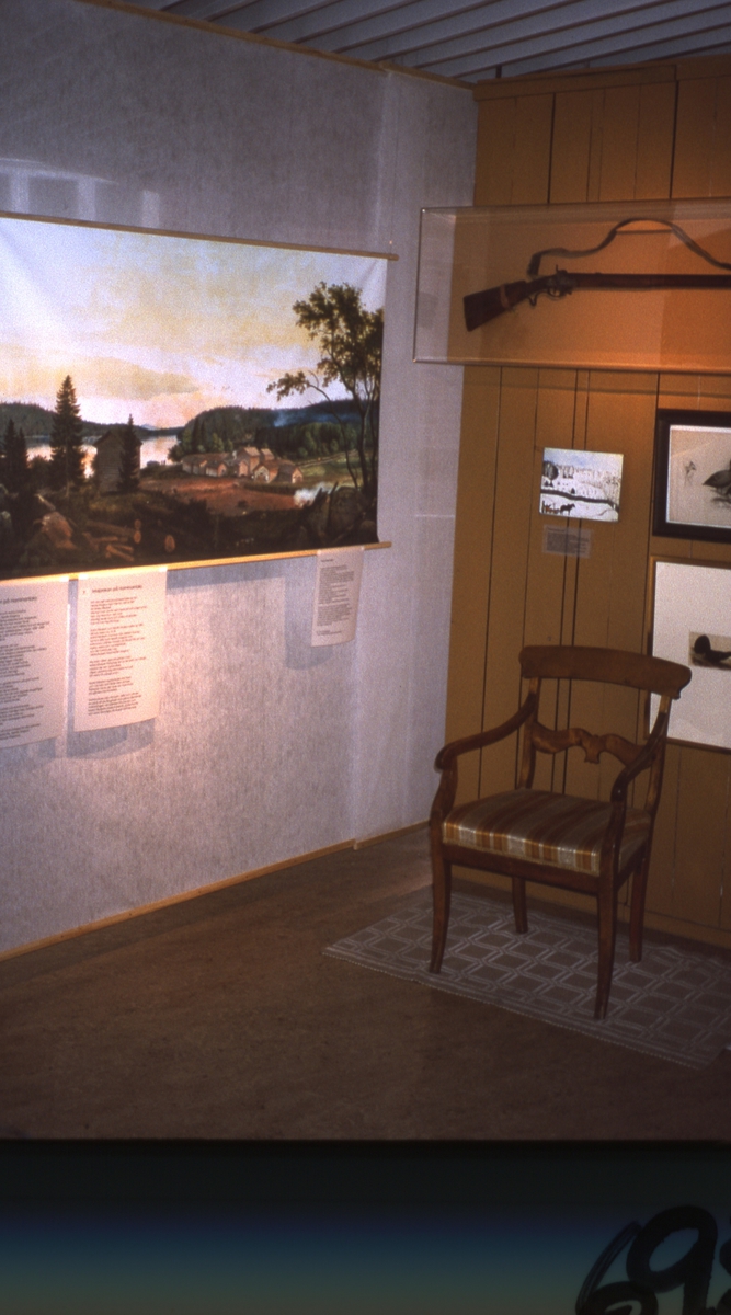 'Motiv av utställningen om konstnärsbröderna von Wright på Göteborgs Naturhistoriska museum: :: :: Tavla och gevär hängande på vägg. :: :: Ingår i serie med fotonr. 6938:1-35.'